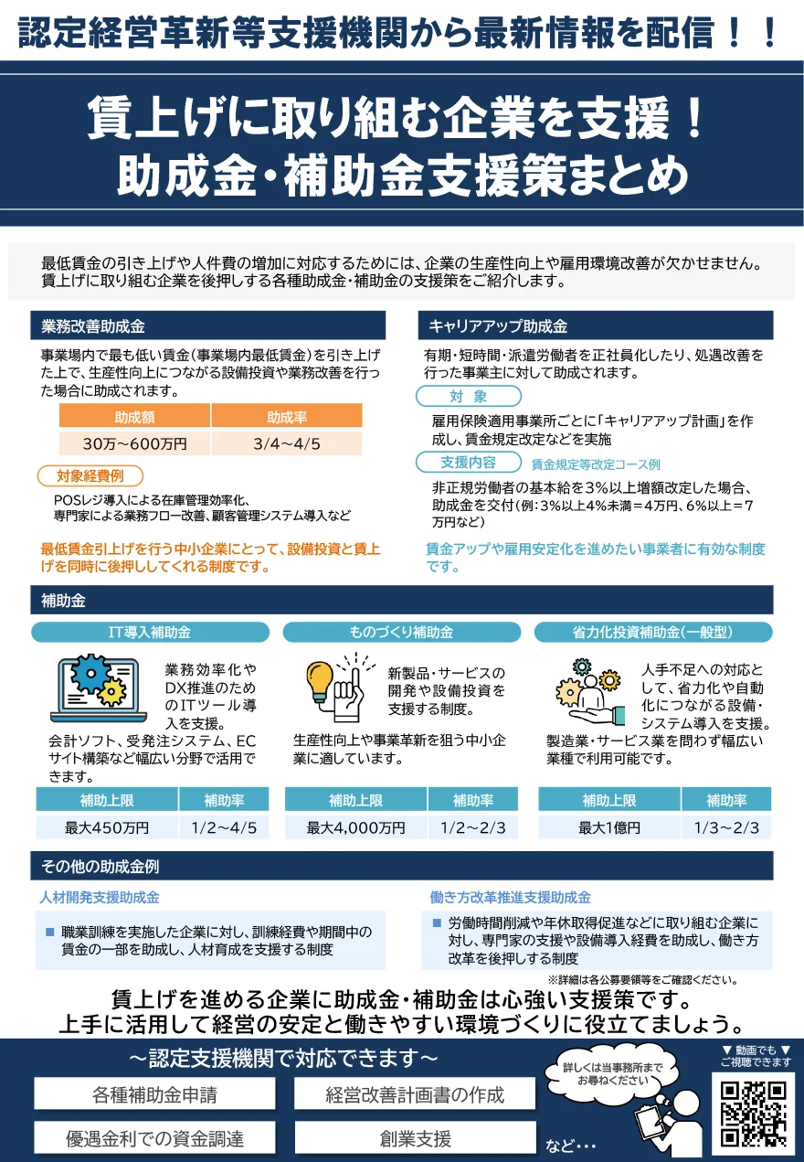 認定支援機関として中小企業を支援するため、財務・補助金・優遇税制・事業承継・M&Aに関する最新情報の提供しております。