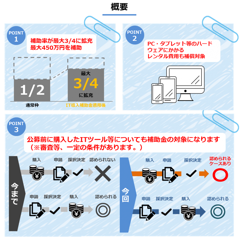 IT導入補助金は、中小企業・小規模事業者等のみなさまが自社の課題やニーズに合ったITツールを導入する経費の一部を補助することで、みなさまの業務効率化・売上アップをサポートするものです。